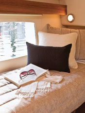 Down below, large side windows and well-placed skylights and hatches bring light and air to staterooms that not only create a sense of space through lighting and design but also are, in fact, generously proportioned for comfortable habitation. Storage space abounds and is found in unexpected places, such as in the cavernous locker underneath the master stateroom berth.