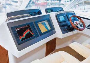 As a result of these various efficiencies, the designers are able to reach desired performance goals with a pair of 775 power plants. Proof of this capability came as soon as I advanced the throttle. Rather than dropping the stern and attempting to plow out of a deep hole in the water, the 56 rose gracefully onto plane with minimal bow rise. I was told that the 56 is based on the hull design of the company’s 550 Offshore Convertible, which has earned a reputation as a smooth, competent big-water performer. As I began to match speed and rpm to fuel flow, I had to keep reminding myself that this vessel measured nearly 60 feet overall length, traveling at speeds of 20-plus knots.