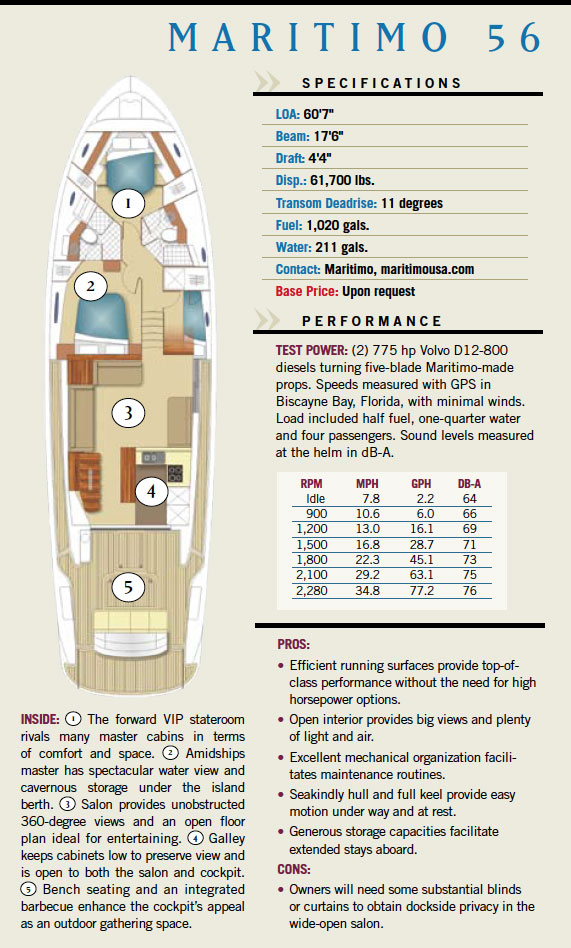 Pulling the 56 away from the fuel dock against a fresh crosswind, I was immediately impressed by the way the boat stayed put. Given her significant windage, I expected to keep a heavy hand on the thrusters. Instead, moderate cross-controlling of the throttles was all that was needed to pull the hull out and away. This resting stability, I later learned, was a result of the hull’s full keel, which projects 18 inches below the running surfaces to enhance lateral stability and provide full protection for the proprietary five-bladed props that Maritimo fabricates in-house.