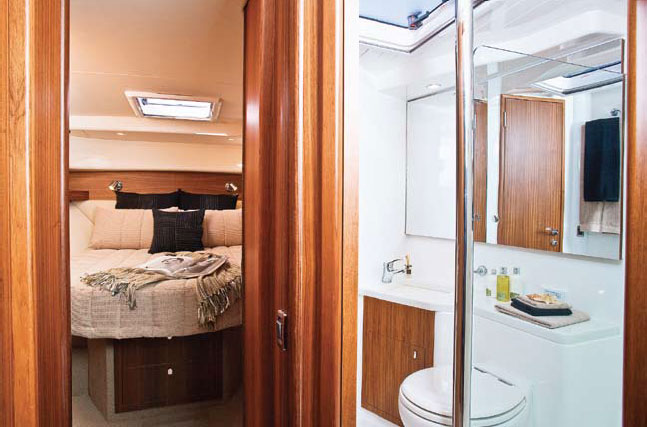 Most crews will naturally gravitate toward the top deck when under way, but it was also interesting to note how this area becomes a favorite gathering space at the dock. Instead of looking into the salon windows of the boat next door, or hanging out in a dock-level cockpit, Maritimo crews can enjoy an elevated view of the marina, whether lounging inside in climatecontrolled comfort or taking the breeze on the balcony-style rear deck. Owners with a penchant for doing their own maintenance will delight in the 56’s engine room. Wiring and plumbing are well-organized in channels and conduits; filters and seacocks are easy to locate; and there’s ample outboard access for the main engines. Equally impressive is the cavernous lazarette aft, which could easily accommodate a dive compressor, folding bikes and a whole range of boat and beach accessories.