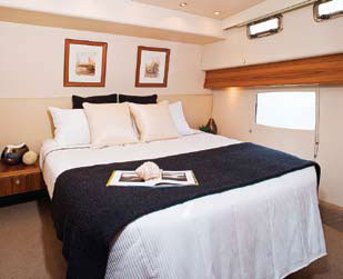 There are other motoryachts in this class that can boast similarly appointed sleeping and bathing quarters — and perhaps a few that can come close to delivering the spectacularly open vistas of the salon and the shaded comfort of the cockpit lounge, but when it comes to the “second story,” Maritimo designs are in a class of their own. No need to go outside to reach the bridge, or to negotiate a tight spiral stairway or ladder, because the 56 features a broad set of steps that are shallow enough for easy negotiation and are also flanked by sturdy rails that will enhance security in a seaway.
