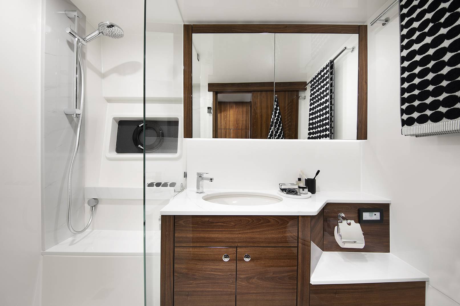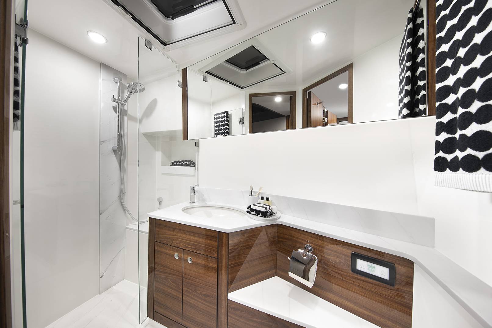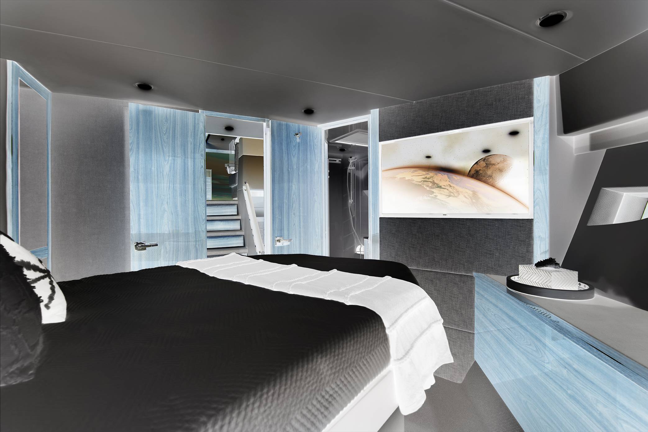 Below deck free-flowing spaces utilize the hull’s volume, maximising height and minimising the number of steps. Three spacious staterooms and two ensuites are on offer, with full-beam king master stateroom, offset queen forward stateroom, and twin single starboard guestroom.