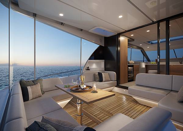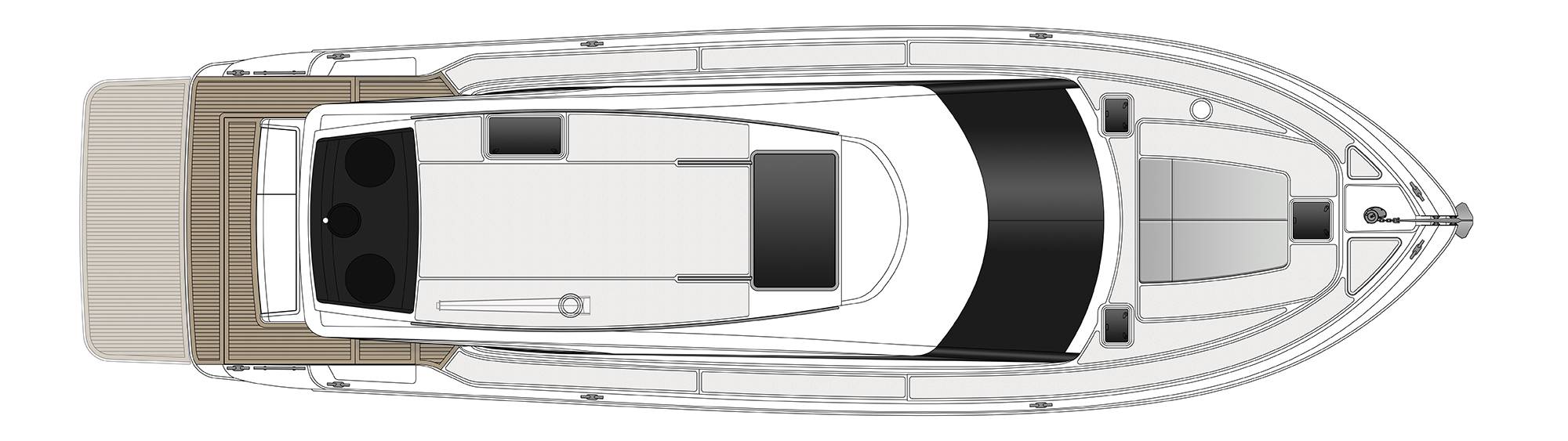 The amount of floor space offered in the upper cockpit alfresco deck leads the market in the mid 50 foot category, with standard rear U-shape lounging and dining table and further option of opposing lounging flanking each side of the area.